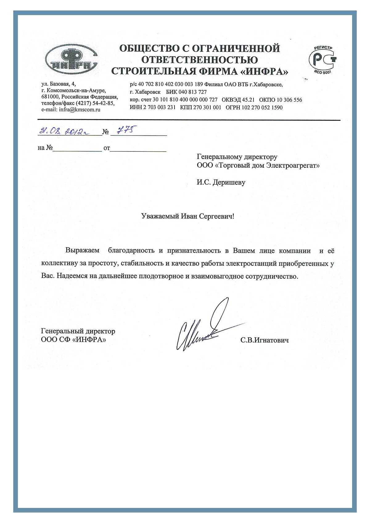 [ALT] => Отзыв контрагентов о компании ООО «ТД Электроагрегат» и исполненном проекте для ООО СФ "ИНФРА", г. Комсомольск-на-Амуре